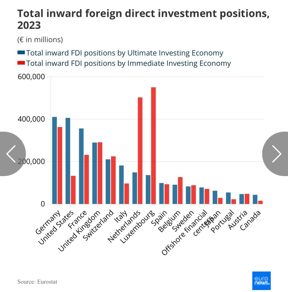 Selon les derniers chiffres d’Eurostat, l’Allemagne a dépassé les États-Unis en tant qu’économie recevant le plus d’IDE, avec 410 milliards d’euros. Cela représente 12,6 % du total de plus de 3000 milliards d’euros pour 2023.