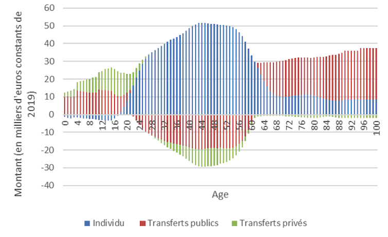 Animé par un collectif d’universitaires réunis autour de Ronald Lee et Andrew Mason, le projet des comptes de transferts nationaux vise à établir une comptabilité exhaustive de l’ensemble des transferts entre les générations qui soit cohérente avec le système des comptes nationaux. L’équipe française, composée notamment de Julien Navaux et Jacques Pelletan, a caractérisé l’ensemble des transferts intergénérationnels entre 1979 et 2019. Dans un article récent, nous avons notamment calculé pour chaque âge de la vie quelles étaient les parts respectives des différentes sources de financement de la consommation, comprise dans son sens le plus large car incluant non seulement la consommation de biens privés mais également la consommation de biens et services publics comme l’éducation ou la santé.