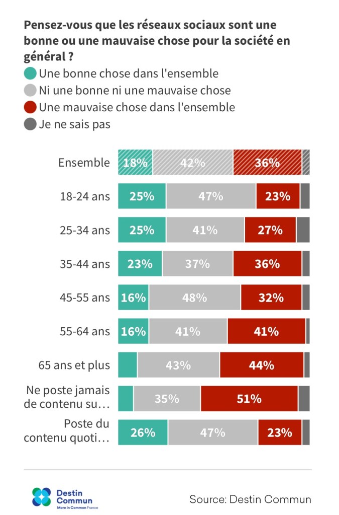 - Seuls 18% des Français considèrent que “les réseaux sociaux sont une bonne chose pour la société en général”, tandis que 36% jugent qu’ils sont “une mauvaise chose”.