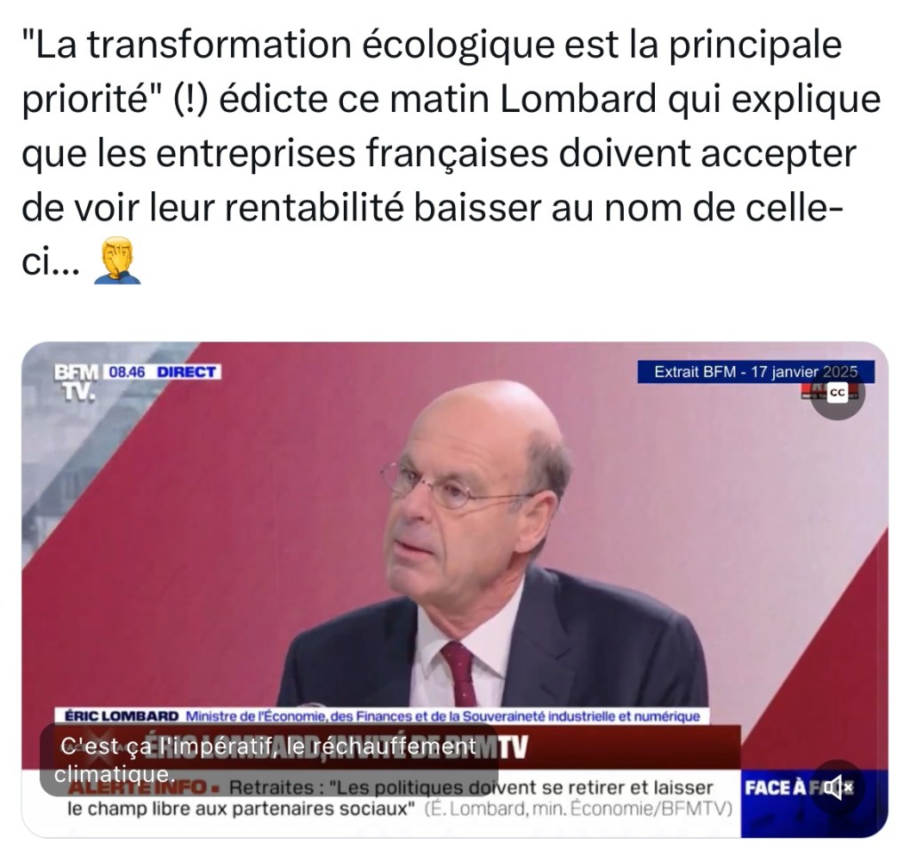 Dans une interview accordée à BFMTV, il considère même qu’il s’agit d’un « impératif » : « La principale priorité du moment, c’est la transformation écologique. Et s’adapter demandera beaucoup d’investissements qui ne sont pas toujours rentables et cela risque de conduire à une baisse de la rentabilité des entreprises. Il faut l’accepter… »