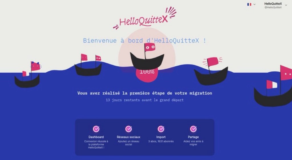 Ce mouvement ne s’arrête pas aux frontières de l’Hexagone, puisque «HelloQuitteX» entend se développer à l’international. Ainsi, grâce à des équipes de bénévoles présents dans différents pays, le site du collectif a déjà été traduit en anglais, allemand et espagnol, mais aussi en arabe et japonais. «Aujourd’hui, on a surtout des usagers français, mais ça ne fait que commencer. Notre appli va rester ouverte», se félicite Benjamin Sonntag. Le chercheur espère que par «effet domino», de nombreuses personnes pourront être touchées et suivre le mouvement. Le porte-parole ne fournit toutefois pas d’objectif chiffré, «car nous n’avons aucune idée du nombre d’usagers actifs que compte X».