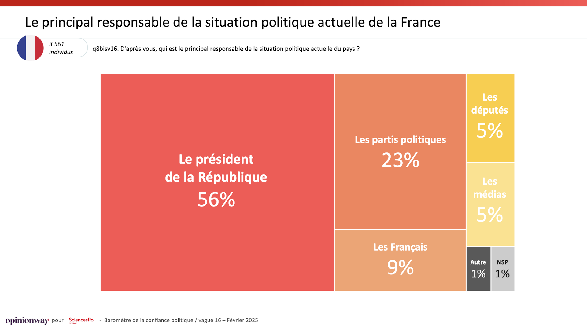 « 56 % font porter la responsabilité de la situation politique actuelle à Emmanuel Macron. Les conséquences de cette décision furent perçues comme le retour à l’instabilité de la IVe République, à une situation où l’on ne comprend plus rien, ni les objectifs ni les priorités. Les données de notre enquête montrent cet extrême sentiment de confusion.