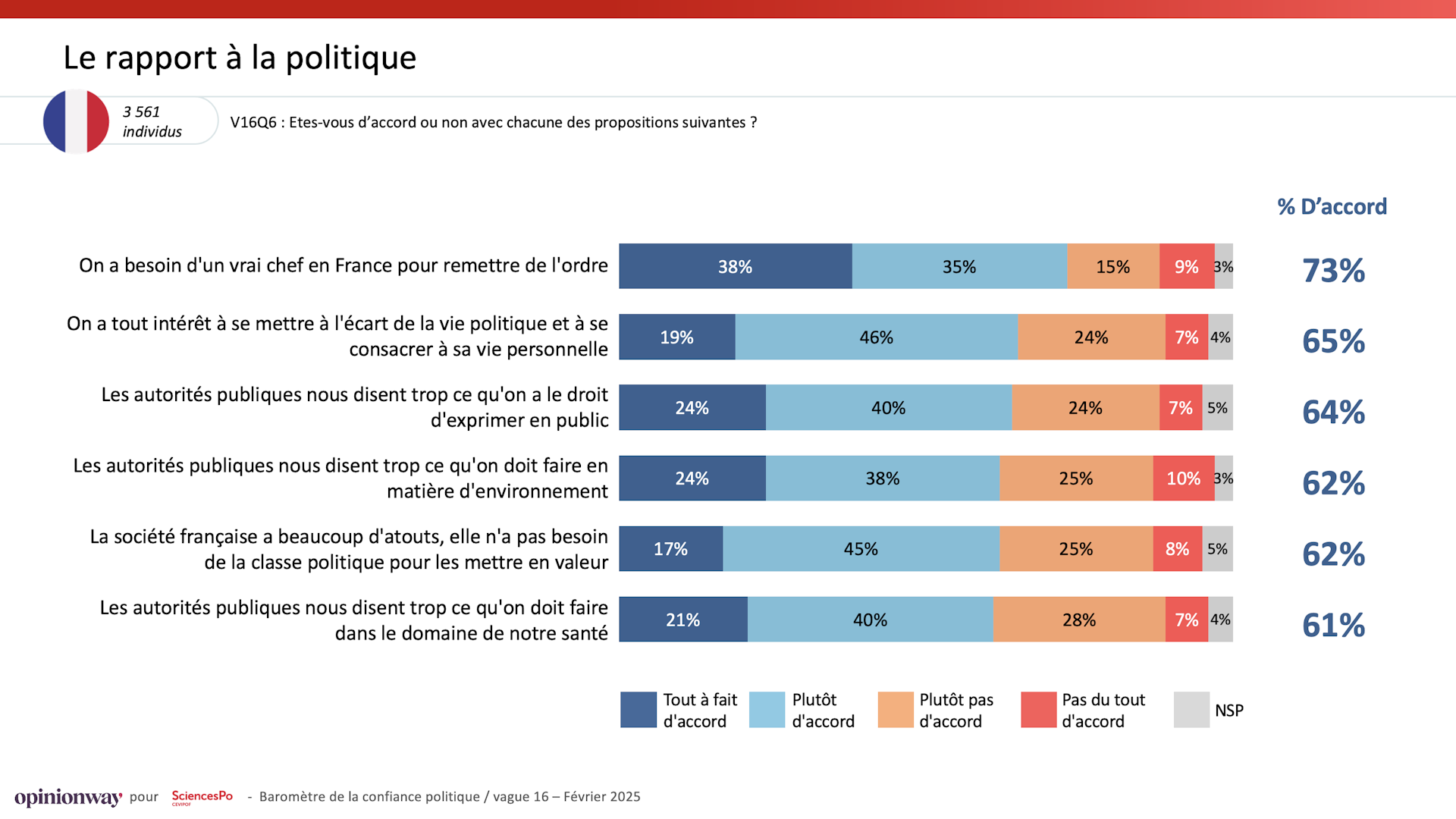 « L’une des demandes, c’est un besoin d’autorité : 73 % souhaitent « un vrai chef en France pour remettre de l’ordre », contre 60 % en Allemagne et en Italie. Elle se double d’une volonté marquée de mise en œuvre d’une démocratie directe avec un fort soutien des Françaises et des Français aux référendums et à une démocratie plus horizontale et participative.