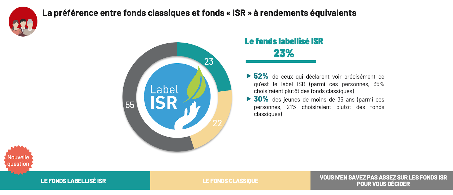 Dans le cadre de notre sondage, nous avons proposé aux Français deux fonds de rendements attendus comparables l’un ISR ou socialement responsable, l’autre classique. Face à ce choix, seuls 23 % d’entre eux (30 % chez les moins de 35 ans) se portent sur le fonds vert, 25 % penchent pour le fonds classique et 52 % déclarent rester indécis tant les deux fonds leur semblent pour finir similaires.