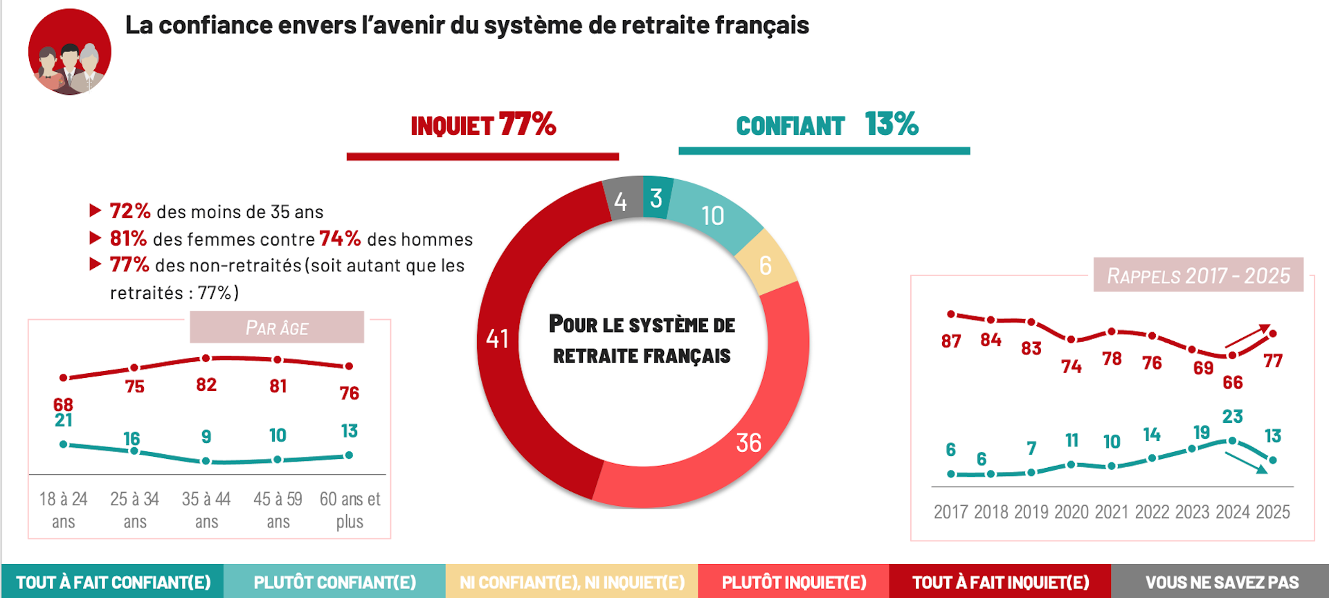 Les Français questionnent aussi le financement du système de retraite. Après avoir baissé ces dernières années, notamment suite à la réforme de 2023, l’inquiétude pour l’avenir du régime général des retraites repart à la hausse. À nouveau, plus de trois Français sur quatre s’en disent inquiets : 77 %, + 11 points en un an, après une baisse de 12 points entre 2021 et 2024.
