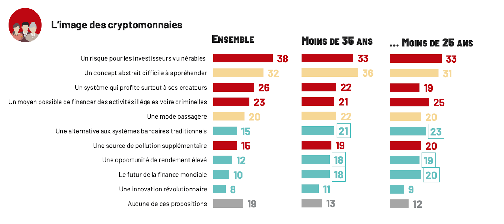 L’année 2024 serait-elle celle du point de bascule pour les cryptoactifs ? Si 30 % des moins de 35 ans choisissaient le fonds ISR dans notre question précédente, ils seraient près du quart à avoir aussi une bonne image des cryptoactifs qu’ils voient même, pour une part non négligeable d’entre eux, comme un futur possible de la finance mondiale !