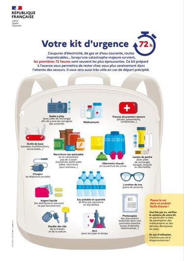 Côté pharmacie, il est préconisé d’avoir du paracétamol, des compresses, mais aussi un sérum physiologique dans sa salle de bain. « Il s’agit de dire aux Français : ‘Soyez prêt à faire face quelques jours en autonomie' », indique une source à l’origine du livret de survie.