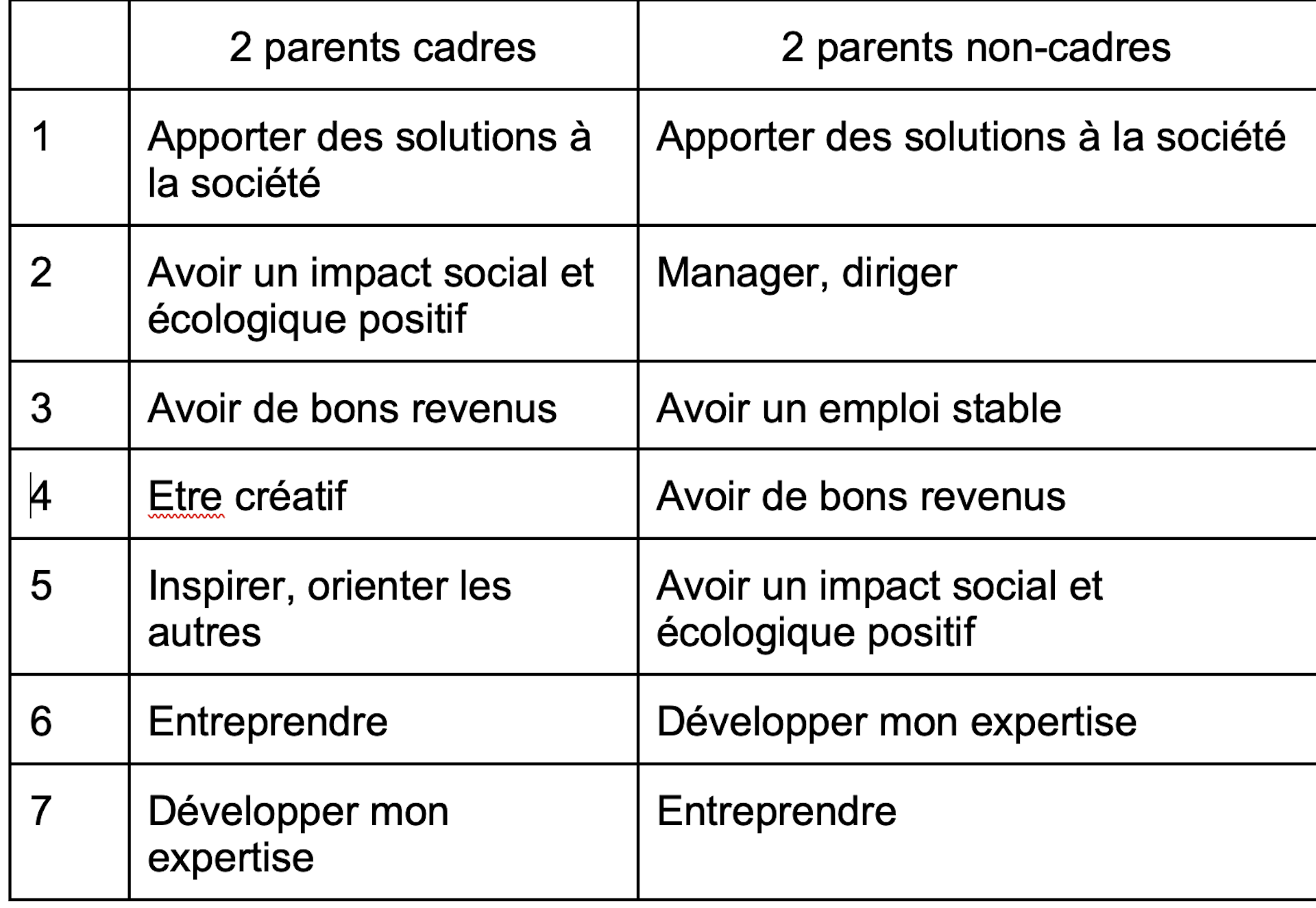 En effet, les jeunes dont les deux parents ne sont pas cadres affichent dès la deuxième place un désir de « manager, diriger », d’« avoir un emploi stable », et d’« avoir de bons revenus ». Ils recherchent donc la carrière managériale traditionnelle.