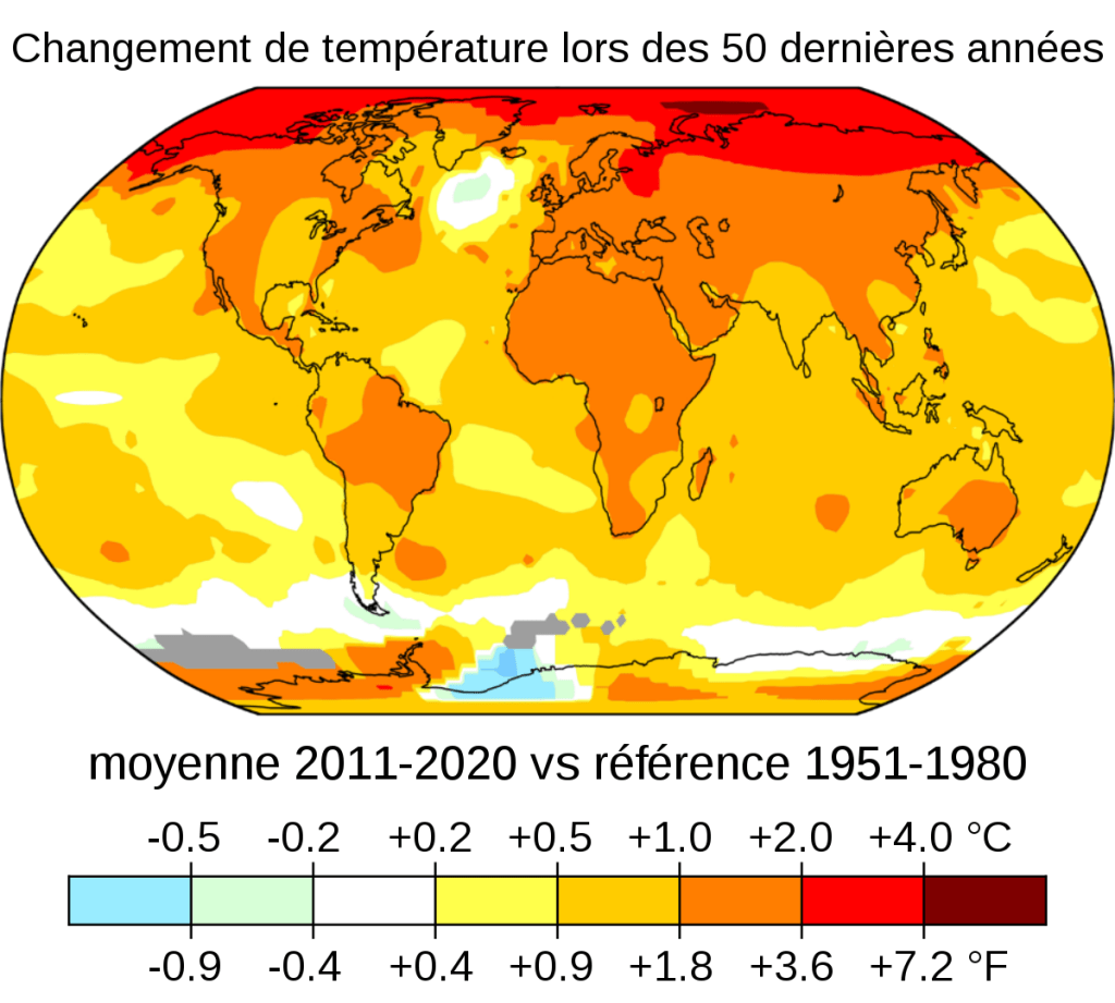 Sur une autre échelle de temps, ainsi que l’explique un article du Centre national de la recherche scientifique (CNRS – lien archivé) résumant les résultats de l’étude de détection et d’attribution de 2022, la température moyenne de la France cette année-là était 1,7 °C supérieure à celle du pays entre 1900 et 1930. Soit un chiffre « bien au-dessus de la hausse moyenne de températures à l’échelle globale, que le Giec évalue à 1,2 °C. «
