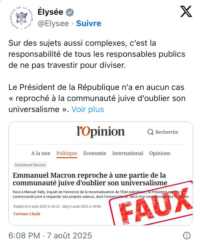 « Quelques heures plus tard, l’Élysée dément de façon virulente sur X : « Le Président de la République n’a en aucun cas “reproché à la communauté juive d’oublier son universalisme”.