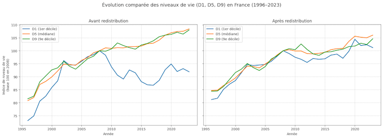 Figure – Évolution comparée des niveaux de vie (D1, D5, D9) en France, 1996–2023, avant et après redistribution. – Source : Insee