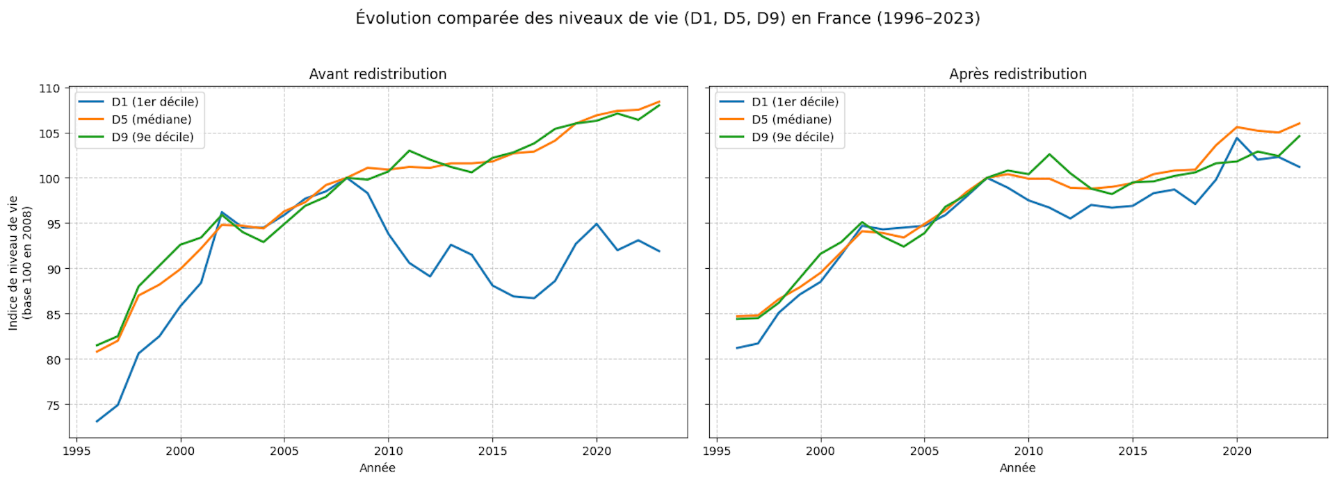 Figure – Évolution comparée des niveaux de vie (D1, D5, D9) en France, 1996–2023, avant et après redistribution. – Source : Insee