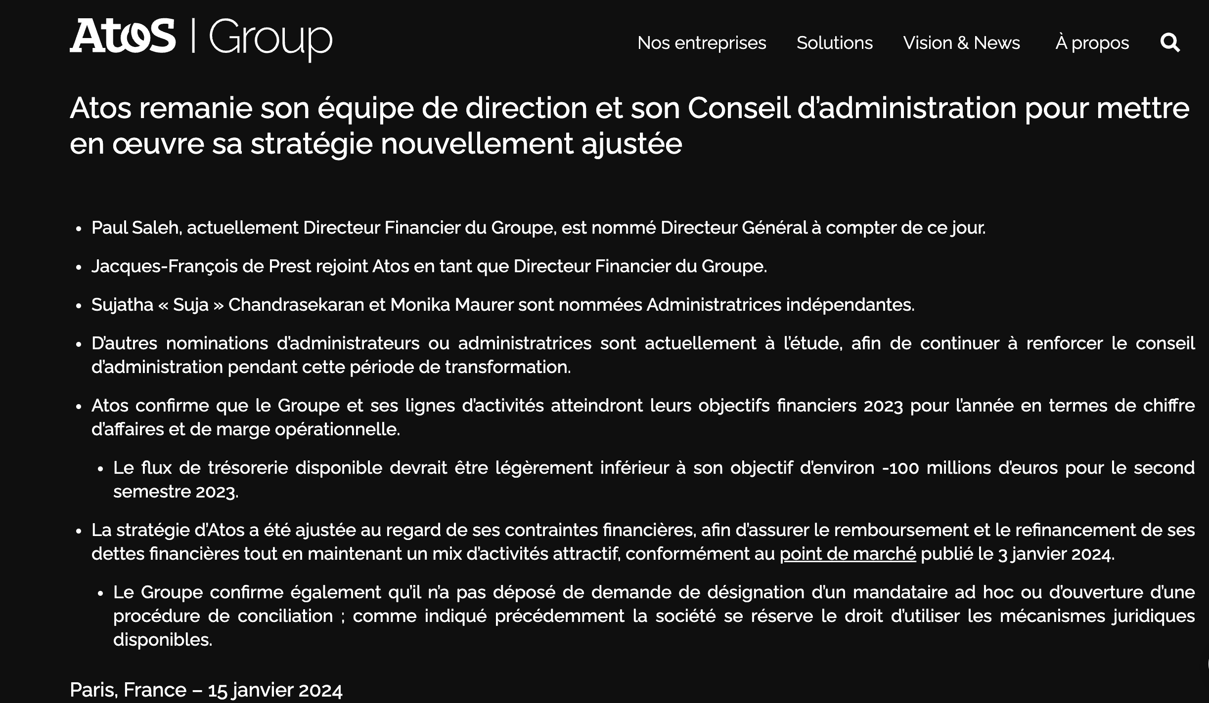 En février dernier, l’entreprise de service numérique (ESN) dont le siège est à Bezons (Val-d’Oise) avait d’abord obtenu du tribunal de commerce de Pontoise l’ouverture d’un mandat ad hoc confié à Hélène Bourbouloux, l’administrateur judiciaire la plus sollicitée quand un dossier devient explosif – elle était au chevet de Rallye Casino, d’Orpea, de FagorBrandt, etc.. Puis le 26 mars, Atos est entrée en procédure de conciliation amiable avec ses créanciers. A charge pour le groupe de trouver un accord avec les banques et détenteurs d’obligations d’ici l’été. Une négociation qui promet d’être ardue.