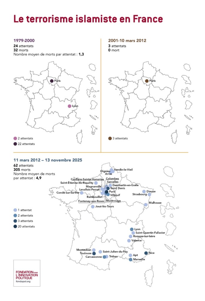 Données mises à jour au 13 novembre 2025 : victimes françaises d’attentats islamistes en France (PDF), à l’étranger (PDF) et totales (PDF) depuis 1979.
