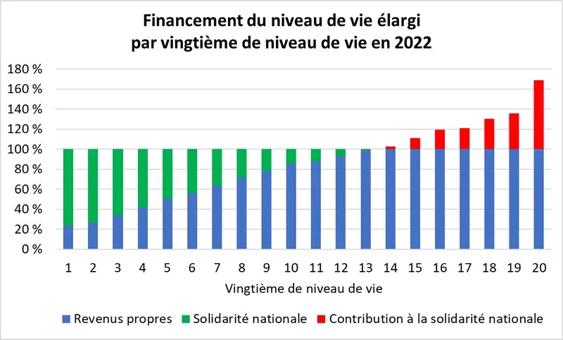 C’est, selon moi, le premier enseignement que l’on peut tirer de ce graphique de Sylvain Catherine, qui divise la population en 20 groupes égaux (vingtiles) et montre clairement comment la solidarité nationale (en vert) finance jusqu’à 85-90 % du niveau de vie des 5 % les plus pauvres, décroît progressivement pour représenter encore environ 20-25 % au milieu de la distribution, tandis que les revenus propres (en bleu) dominent chez les plus aisés.