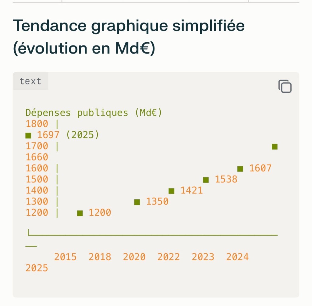 Le chiffre de 1 697 Md€ pour 2025 sert de base pour le projet 2026 à 1 722 Md€, soit une augmentation modérée d’environ 25 Md€ (environ +1,5%), intégrant un effort de maîtrise des dépenses de 30 Md€ par rapport à la trajectoire spontanée.