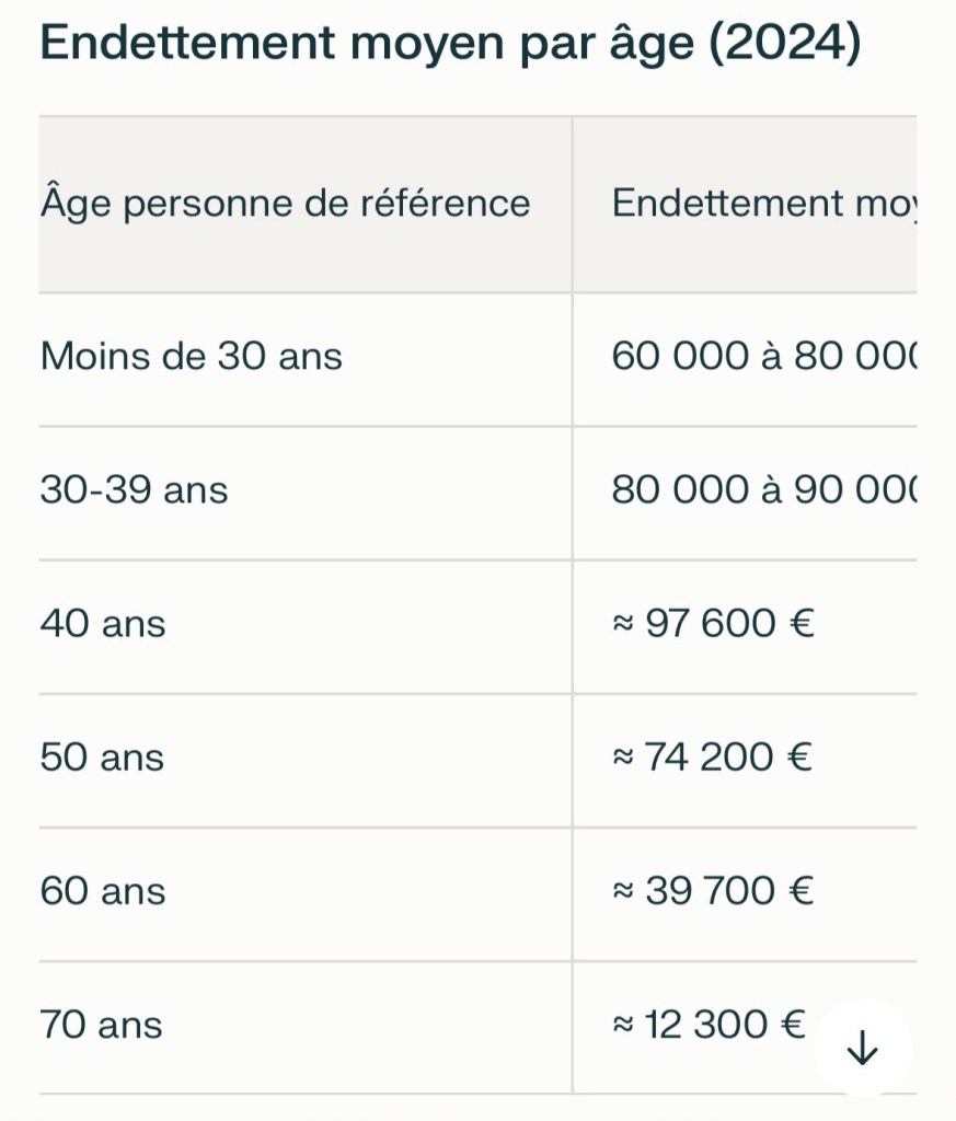 Les données Insee 2024 (enquête Patrimoine) montrent que l’endettement moyen des ménages reste très faible au-delà de 70 ans et quasi nul après 80-90 ans, en raison du remboursement complet des prêts immobiliers (durée typique 20-25 ans) et de la rareté des nouveaux crédits seniors.