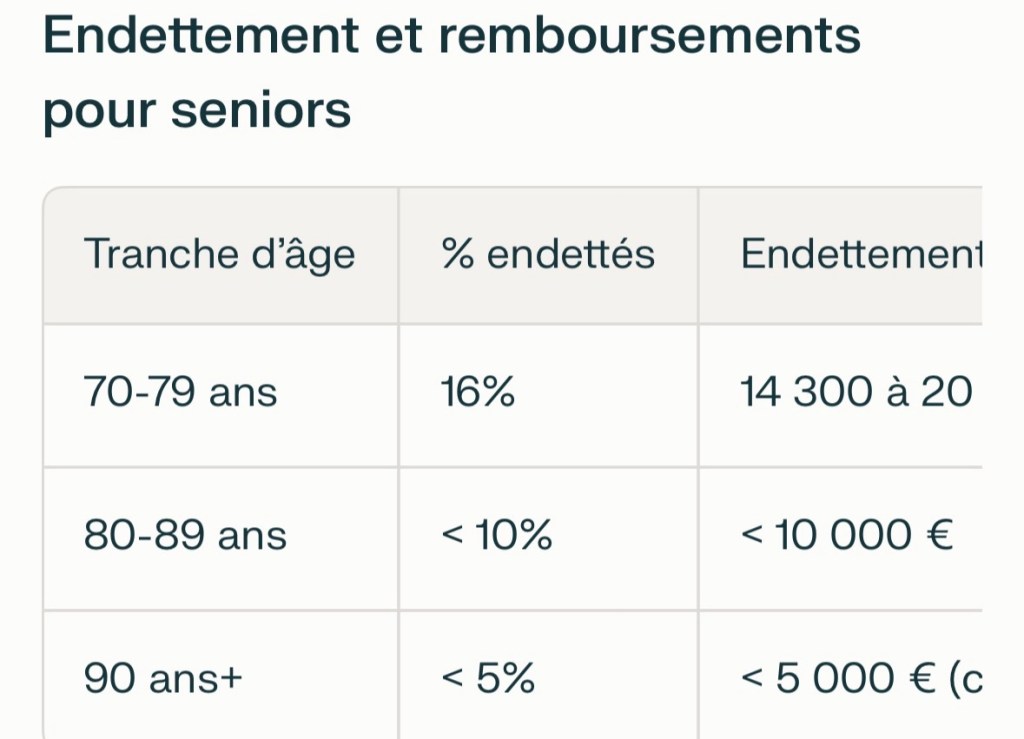• Au-delà de 80 ans, l’endettement concerne <10% des ménages, souvent <5 000 € (médiane), avec remboursements minimes sur 3-5 ans restants.
