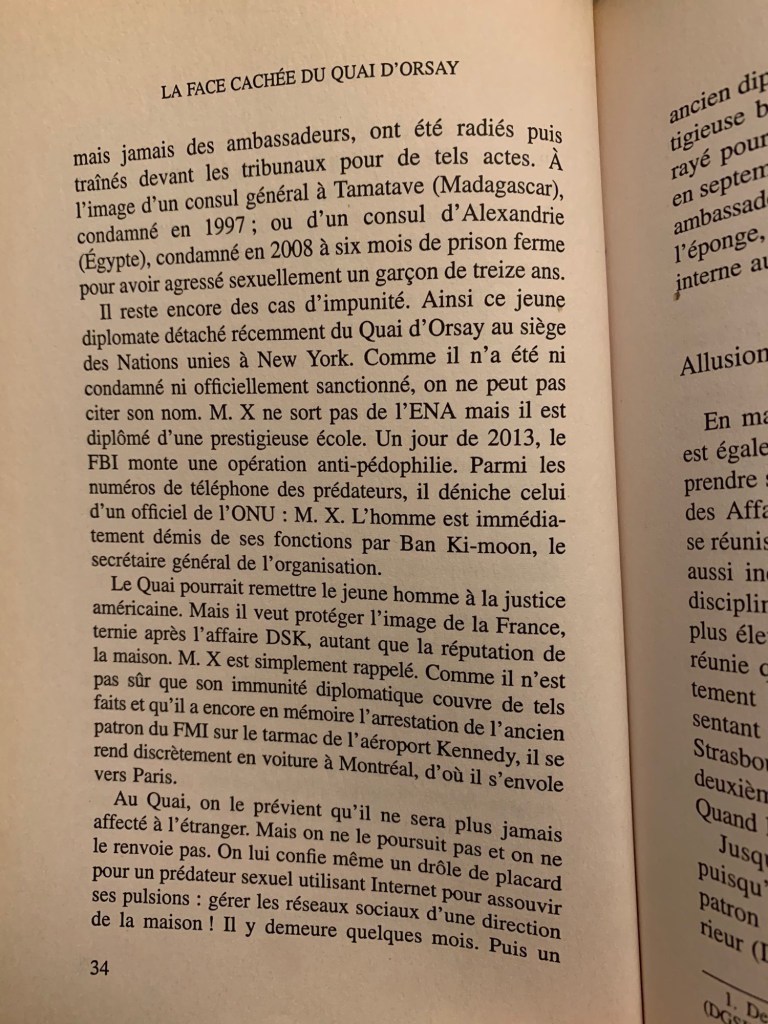 Ses méfaits y sont décrits avec force détails, dans une partie intitulée Un scandale de pédophilie étouffée par le Quai d’Orsay.