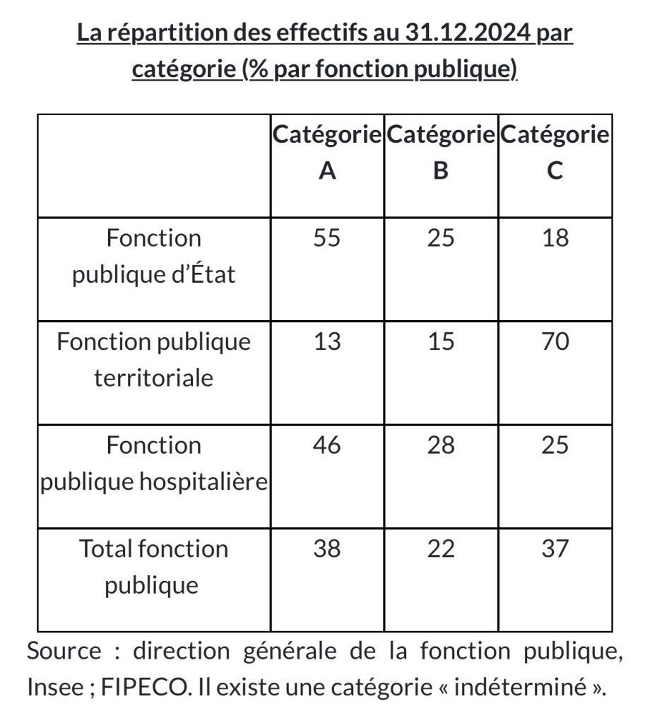 Les agents de catégorie A sont majoritaires dans la fonction publique d’État, surtout en raison du poids des enseignants. En revanche, les agents de catégorie C représentent 70 % de la fonction publique territoriale.