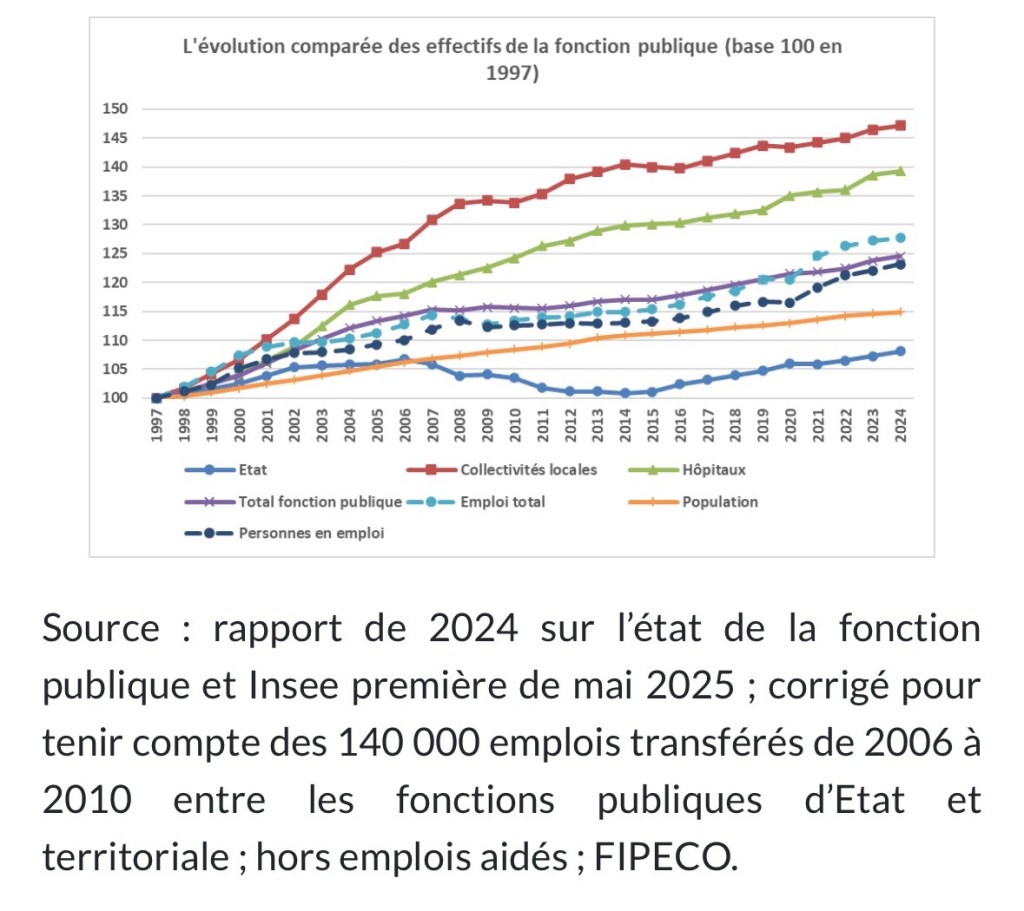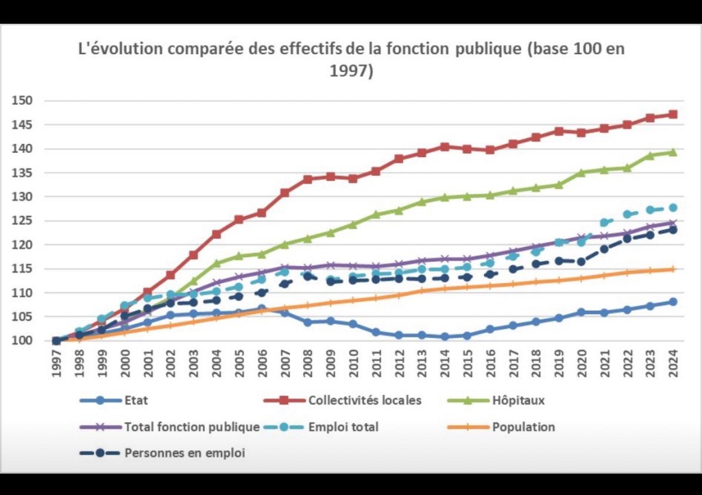 Sur l’ensemble des années 1997 à 2024, les effectifs publics ont augmenté de 1 151 000 dont 205 000 dans la fonction publique d’État, 597 000 dans les collectivités territoriales et 351 000 dans les hôpitaux.