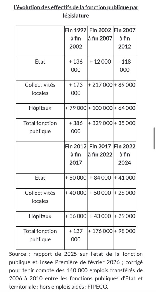 La répartition de la hausse des effectifs de l’ensemble de la fonction publique par législature est la suivante : + 386 000 sur 1997-2002 ; + 329 000 sur 2002-2007 ; + 35 000 sur 2007-2012 avec notamment une baisse dans la fonction publique d’État (– 118 000) ; + 127 000 sur 2012-2017 avec un ralentissement dans les collectivités locales ; + 176 000 sur 2017-2022 dont 84 000 dans la fonction publique d’Etat.