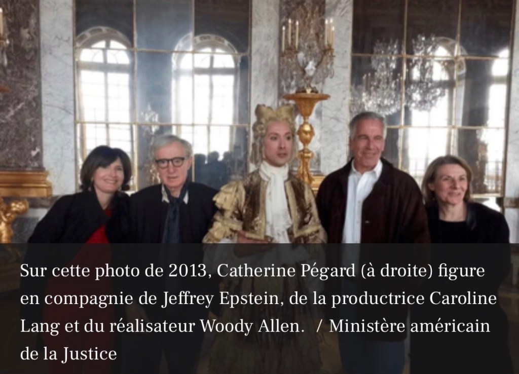 Le cliché a refait surface sur BFMTV et dans Le Monde. Sur cette photographie datant de 2013, Catherine Pégard, alors présidente du domaine de Versailles, figure en compagnie de Jeffrey Epstein, de la productrice Caroline Lang et du réalisateur Woody Allen. À cette époque, Epstein effectuait une visite privée sous l’égide de Jean-Luc Brunel, son proche collaborateur français.